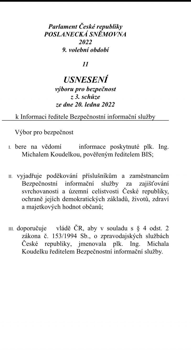 Poslanci také v usnesení doporučili Vládě ČR, aby jmenovala zatím pověřeného ředitele Michala Koudelku do funkce řádného ředitele BIS na další funkční období.